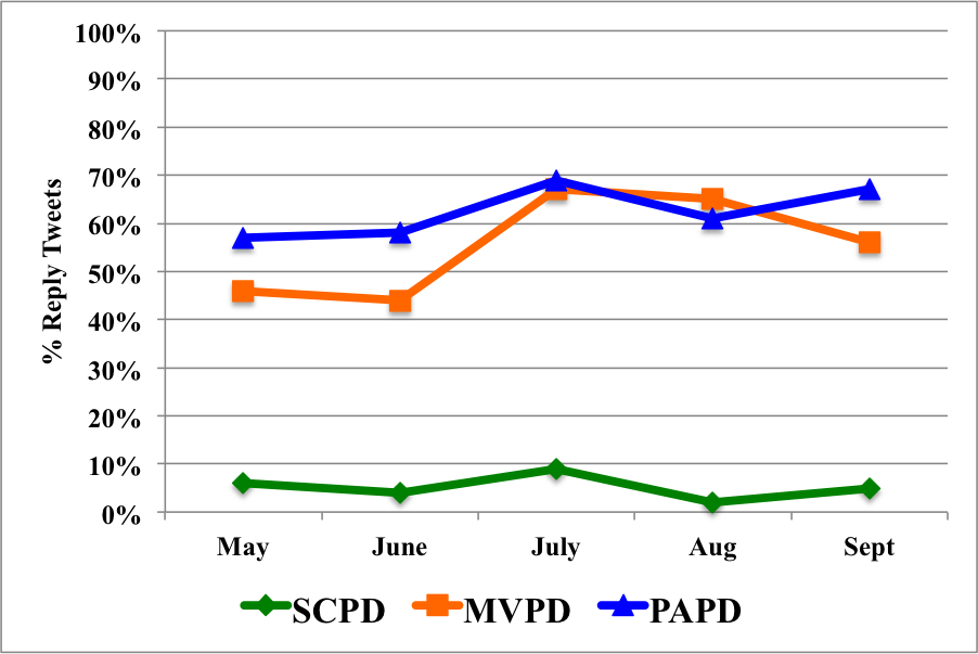 Determining whether an agency uses a two-way communication model is as simple as looking at the percentage of their total tweets that are replies to other users. During the study period, 62 percent of the tweets sent by the Palo Alto Police Department and 51 percent of those sent by the Mountain View Police Department were replies, whereas only 2.9 percent of the Santa Clara Police Department’s tweets were replies.3