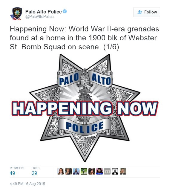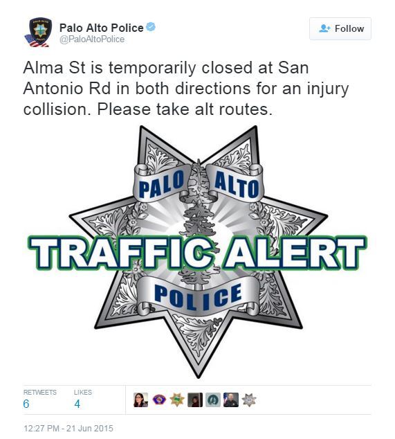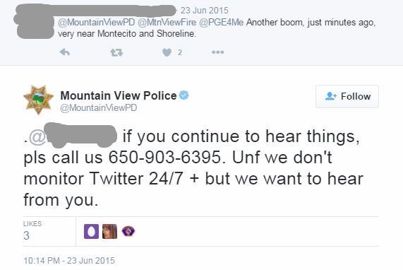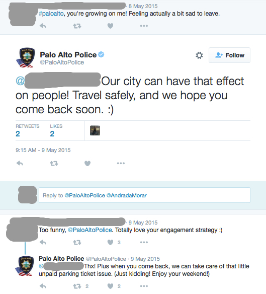 Next, the two agencies employing a two-way communication model routinely self-initiated reply tweets to random tweets by Twitter users. The user does not always need to be the one to initiate a two-way conversation; the police agency can do it too. The Mountain View and Palo Alto Police Departments often sent tweets to users that took the form of a conversational reply or other acknowledgement of the user’s tweets. This strategy potentially benefits the agency in a number of ways. First, it brings the user’s attention to the agency’s Twitter account and, in so doing, may generate a new follower. Next, the user may retweet the agency’s message to show their own followers the novelty of having a police department respond to them in a conversational manner. Lastly, it shows the user that the agency is active on Twitter, engaged with other users, and willing to initiate conversations online.