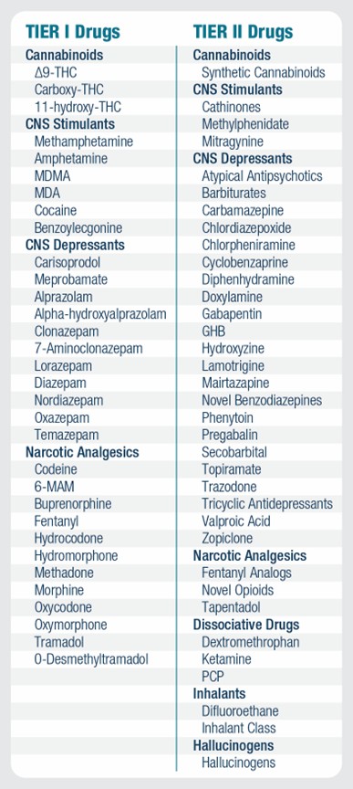 Coincidence? It seems to be a U.S.-wide trend. According to the National Highway Traffic Safety Administration, one person was killed every 39 minutes in an alcohol-related crash in 2021.6 But alcohol is not the only concern; the use of illicit drugs, legalized drugs such as cannabis, and prescription medications may also impair a driver’s abilities. According to a 2022 estimate, approximately 13.6 million people drove under the influence of illicit drugs in 2021.7 The National Safety Council has recommended that forensic toxicology labs regularly test blood for 35 of the most often encountered drugs and metabolites. Referred to as Tier I drugs (see Figure 1), they are now included as a testing standard in many forensic toxicology labs. Tier II drugs include emerging novel psychoactive substances, prescription drugs, and traditional drugs of abuse with limited or regional prevalence, many of which require advanced instrumentation for detection.8