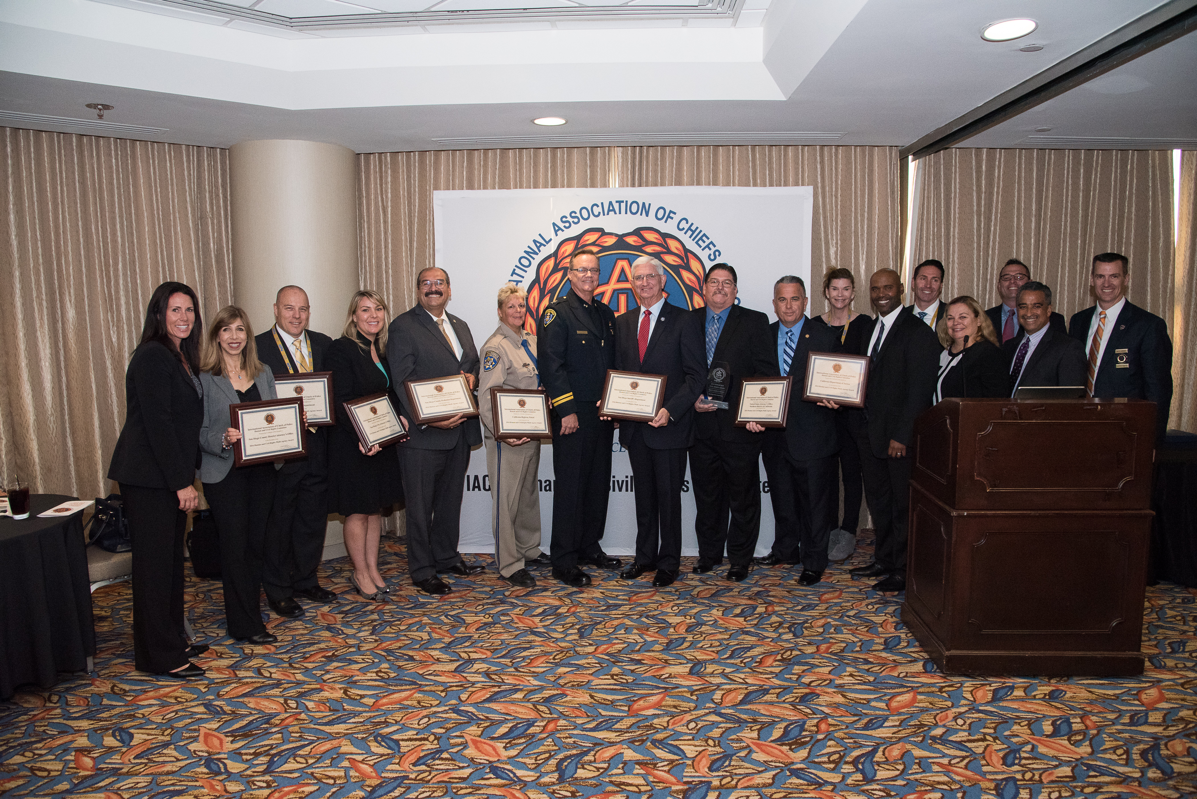 Left to right: Christina Bavencoff, lieutenant, San Diego Sheriff’s Department; Summer Stephen, chief deputy, San Diego County District Attorney’s (DA’s) Office; Craig Carter, captain, Escondido Police Department; Lara Easton, chief deputy, San Diego City Attorney’s Office; Adolfo Gonzales, chief probation officer, San Diego Probation Department; Deb Schroder, assistant chief, California Highway Patrol; Terry McManus, assistant chief, San Diego Police Department (SDPD); William Gore, sheriff, San Diego Sheriff’s Department; Chris Cameron, sergeant, SDPD; Danny Santiago, task force commander, California Department of Justice; Barbara Rudesill, commander, district attorney investigator, San Diego County DA’s Office; Ryan Love, district attorney investigator, San Diego County DA’s Office; John Marsh, chief, California Department of Justice; Mary Ellen Barrett, deputy district attorney, San Diego County DA’s Office; Matthew Blumenthal, sergeant, SDPD; Miguel Rosario, chief of investigations, San Diego County DA’s Office; and Will Johnson, chief of police, Arlington Police Department, chair, IACP Human and Civil Rights Committee
