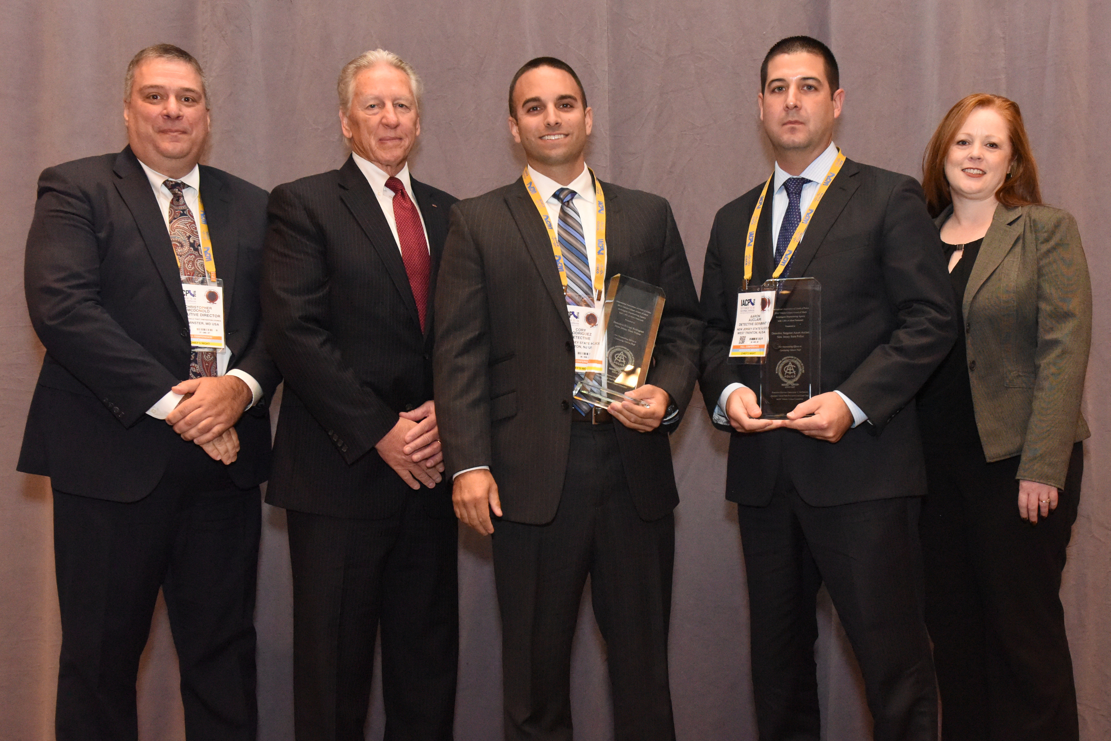 Left to right: Christopher McDonold, executive director, Maryland Vehicle Theft Prevention Council/Department of State Police, chair, IACP Vehicle Crimes Committee; Patrick Clancy, vice president, law enforcement, LoJack Corporation; Cory Rodrigue, detective II, New Jersey State Police; Aaron Auclair, detective sergeant, New Jersey State Police; and Sherry LeVeque, emergency services outreach leader, OnStar