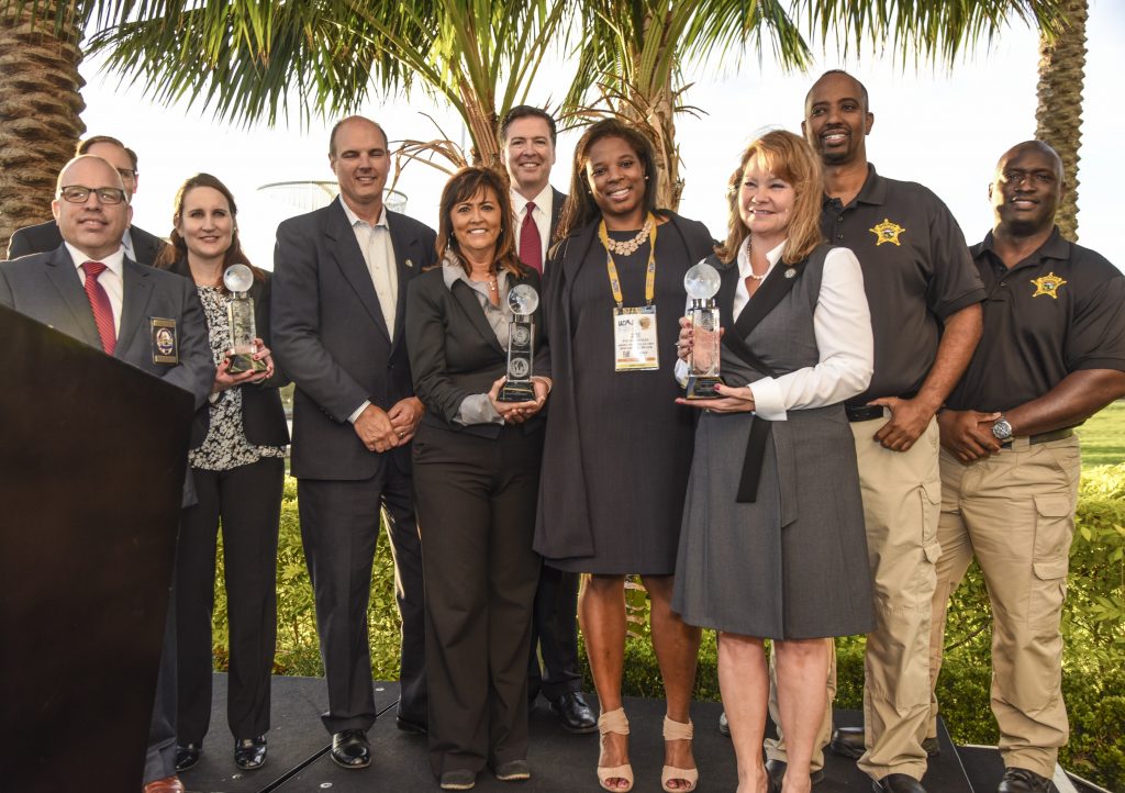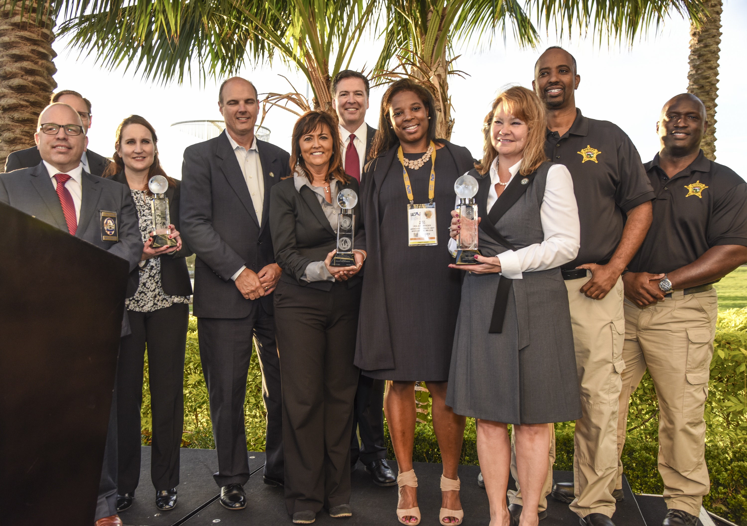 James Comey, director, Federal Bureau of Investigation (FBI); Michael B. Steinbach, executive assistant director, FBI; and the IACP/Booz Allen Hamilton Committee on Terrorism awardees (Hennepin County Sheriff’s Office, Minneapolis Police Department, St. Paul Police Department)