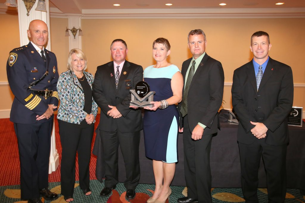 Left to right: Richard Smith, chief, Wakefield Police Department, vice president at large, IACP; Shelley K. Rose, president and CEO, LogIn, Inc.; Brien Gault, assistant chief of police, Glasgow Police Department; Renee Jones, victim specialist, Glasgow Police Department; Bruce Barstad, chief, Glasgow Police Department; and David Porter, chief, Dewitt Police Department, chair, IACP Victim Services Committee