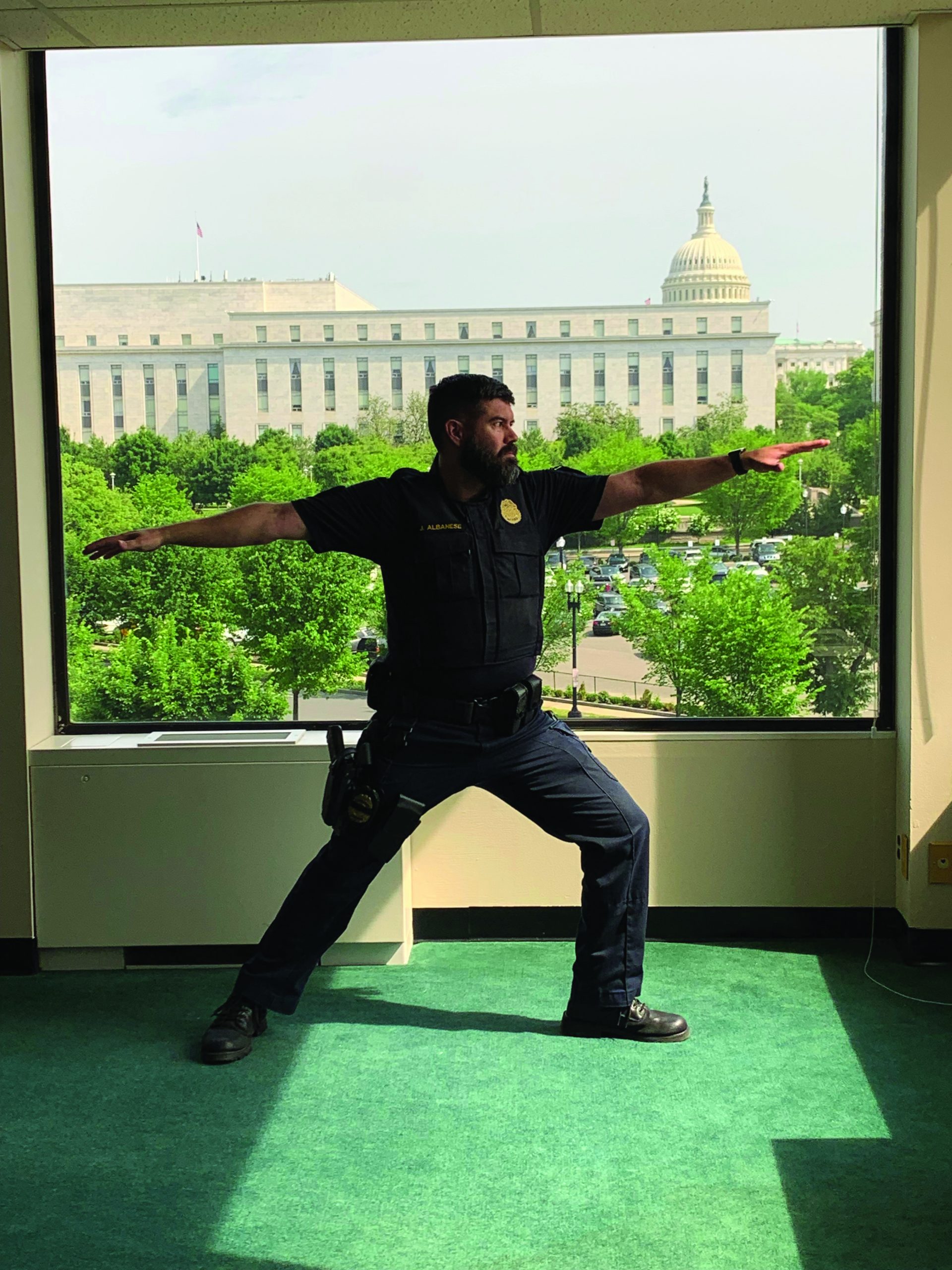 Previous ImageNext Image Officer Safety & Wellness Officer Safety & Wellness Yoga Warrior U.S. Capitol Police (Washington, DC) USCP Officer Jeff Albanese stands with conviction in the Warrior II yoga pose at the Howard C. Liebengood Center for Wellness with the U.S. Capitol in the background.