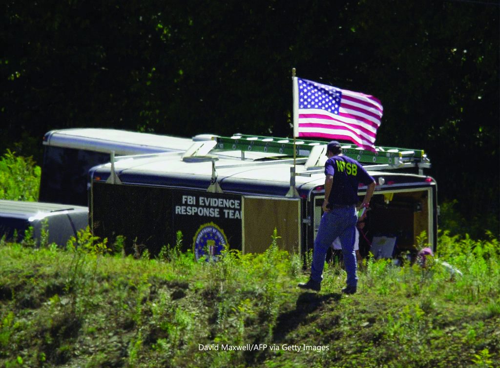 A National Transportation Safety Board worker walks by an FBI trailer at the crash site of United Airlines Flight 93 in Shanksville, PA,12 September 2001. The plane from Newark, NJ, bound for San Francisco, CA, is believed to have been hijacked, and crashed in a field in Shanksville. Forty-five people were on board the plane, and there were no survivors. AFP PHOTO/David MAXWELL