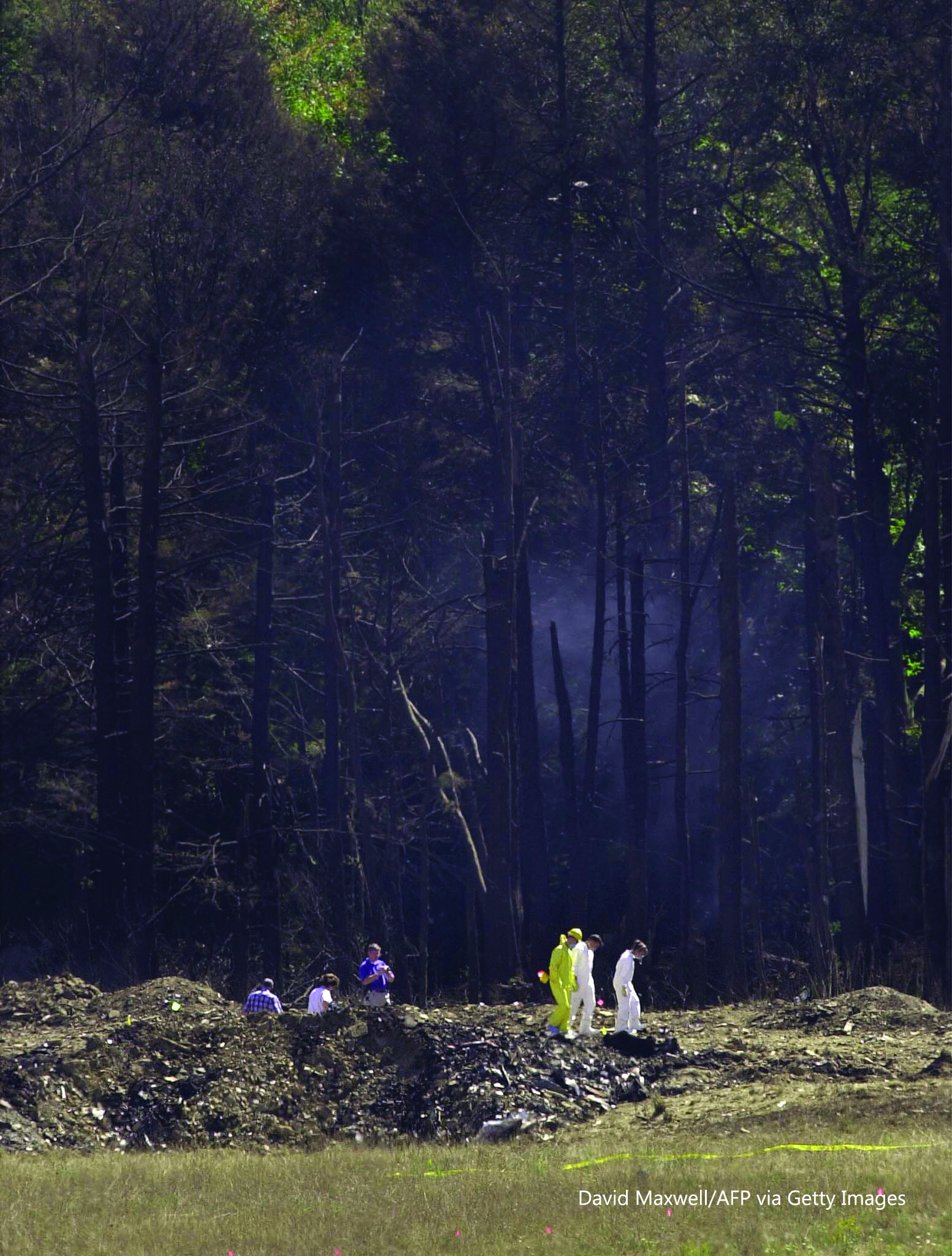 Emergency workers search the crash site of United Airlines Flight 93 in Shanksville, Pennsylvania, 12 September 2001. The hijacked plane crashed killing all 45 people on board. AFP PHOTO/David MAXWELL
