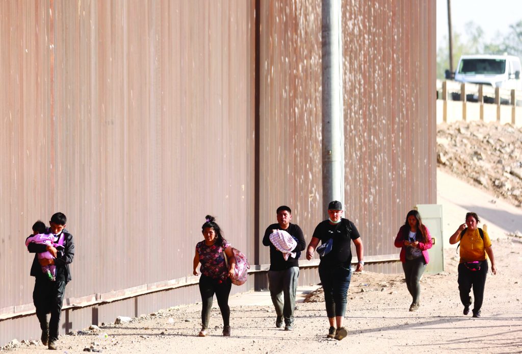 YUMA, ARIZONA- MAY 20: Immigrants, some carrying small children, walk to cross through a gap in the U.S.-Mexico border barrier before being processed by the U.S. Border Patrol on May 20, 2022 in Yuma, Arizona. Title 42, the controversial pandemic-era border policy enacted by former President Trump, which cites COVID-19 as the reason to rapidly expel asylum seekers at the U.S. border, was set to officially expire on May 23rd. A federal judge in Louisiana delivered a ruling today blocking the Biden administration from lifting Title 42. (Photo by Mario Tama/Getty Images)