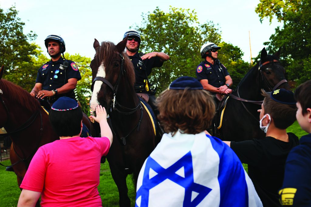 Previous ImageNext Image Long Island Community Rallies Against Anti-Semitic Attacks Children speak with police officers mounted on horses during a rally denouncing anti-Semitic violence on May 27, 2021, in Cedarhurst, New York. (Photo by Michael M. Santiago/Getty Images)