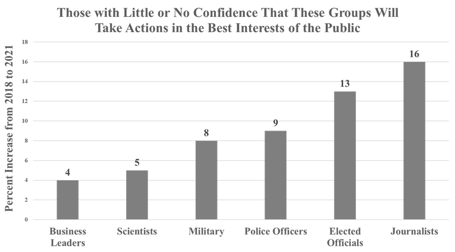 | Figure 1: Percent increase from 2018 to 2021 in those reporting little or no confidence that the groups shown will take actions in the best interest of the public |