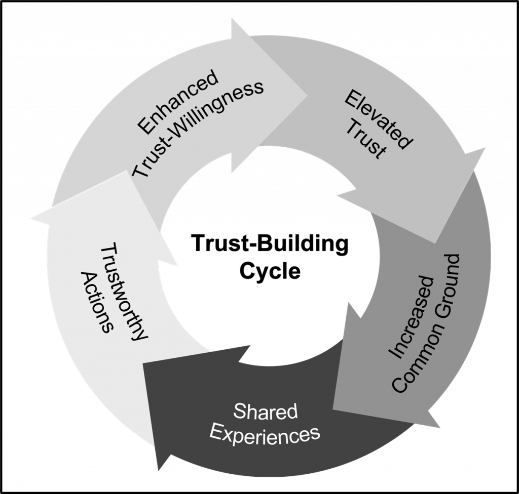 The cycle in Figure 2 often starts with the person being trusted and the person granting trust having shared experiences such as common struggles, goals, or purposes. These shared experiences are a form of common ground that is a necessary precursor to the trust-building process. Shared experiences allow the person or group granting trust to be receptive to the trustworthy actions of the other person or group, which when they occur, enhance trust willingness and elevate trust between the two parties. Elevated trust, in turn, increases the common ground between the two parties, strengthening their shared experiences, thus allowing the cycle to continue.