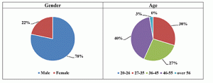 The data collection was conducted from August 2013 to October 2013, and 37 respondents (74 percent of those targeted) answered the questionnaire, either via the Internet or on paper. Of the 37 respondents, 29 were male (78 percent) and 8 were female (22 percent). In relation to age, most of the respondents were 46–55 years old (15 respondents or 40 percent), with 11 respondents (or 30 percent) falling into the age range of 27–35 years; 10 in the 36–45 years of age range (27 percent), and only one respondent over 56 years old (3 percent).