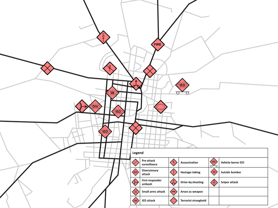 Figure 1: Hypothetical distributed symphonic small arms and IED terrorist attacks in and around a hypothetical U.S. city. H=hostage; SB=suicide bomber; DIV=diversionary attack; IED=improvised explosive device attack; S=sniper attack. Symbols adapted from Department of Defense, Common Warfighting Symbology MIL-STD-2525B, 2005, http://www.mapsymbs.com/ms2525b_ch1_full.pdf.