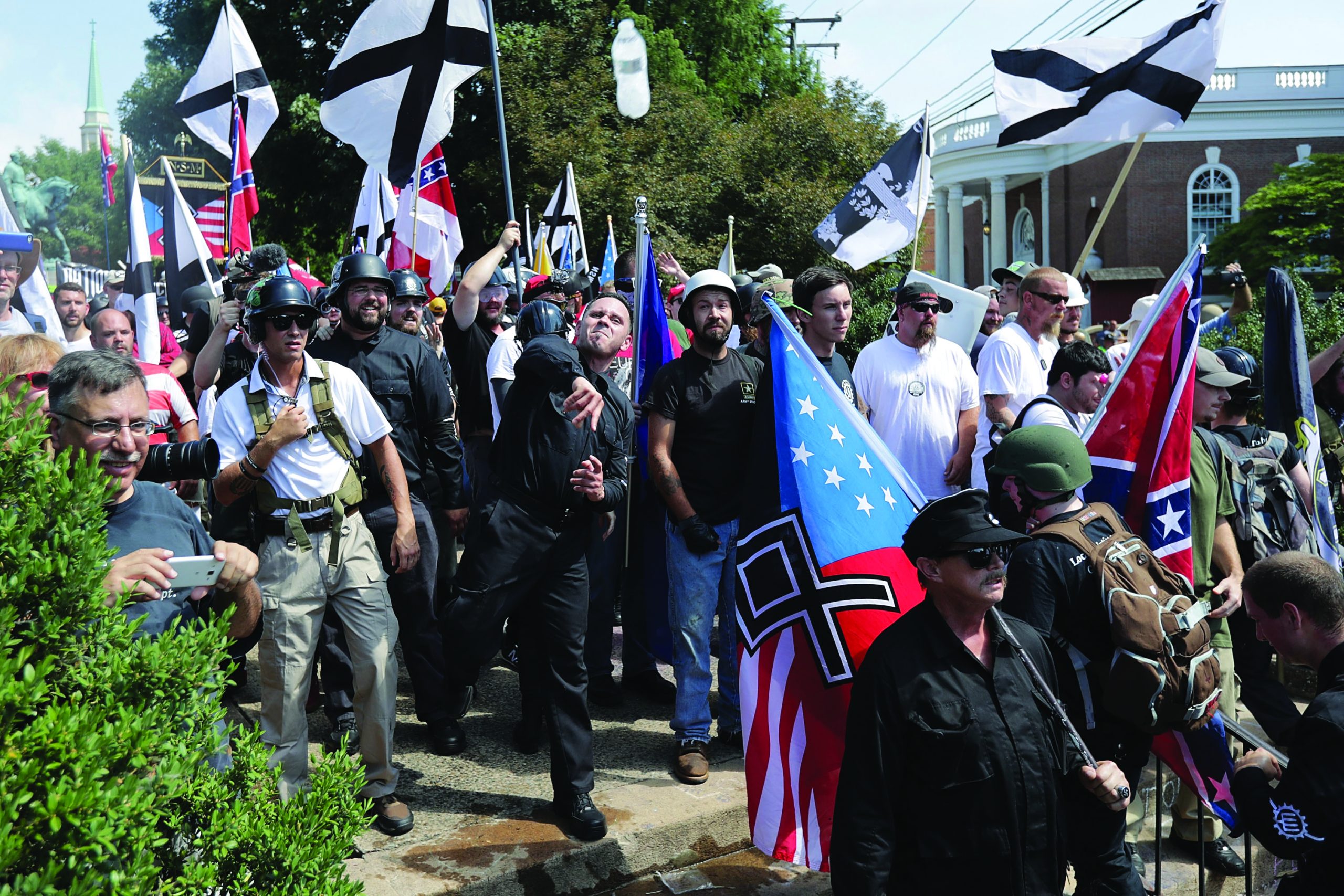 White nationalists, neo-Nazis, KKK, and members of the “alt-right” hurl water bottles back and forth against counter demonstrators on the outskirts of Emancipation Park during the Unite the Right rally August 12, 2017, in Charlottesville, Virginia.