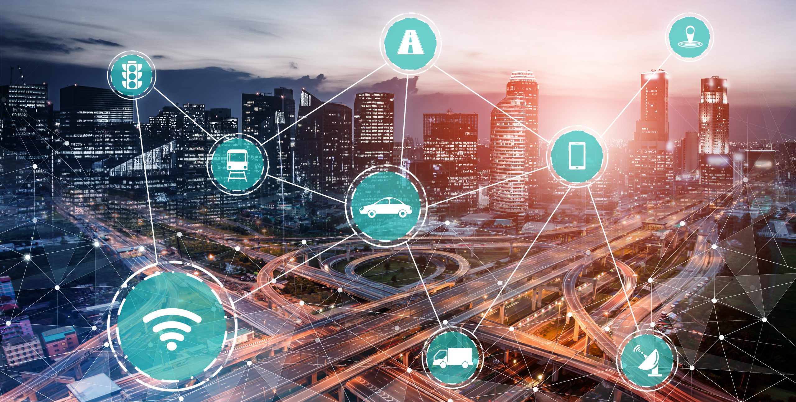 Smart transport technology concept for future car traffic on road . Virtual intelligent system makes digital information analysis to connect data of vehicle on city street. Futuristic innovation.