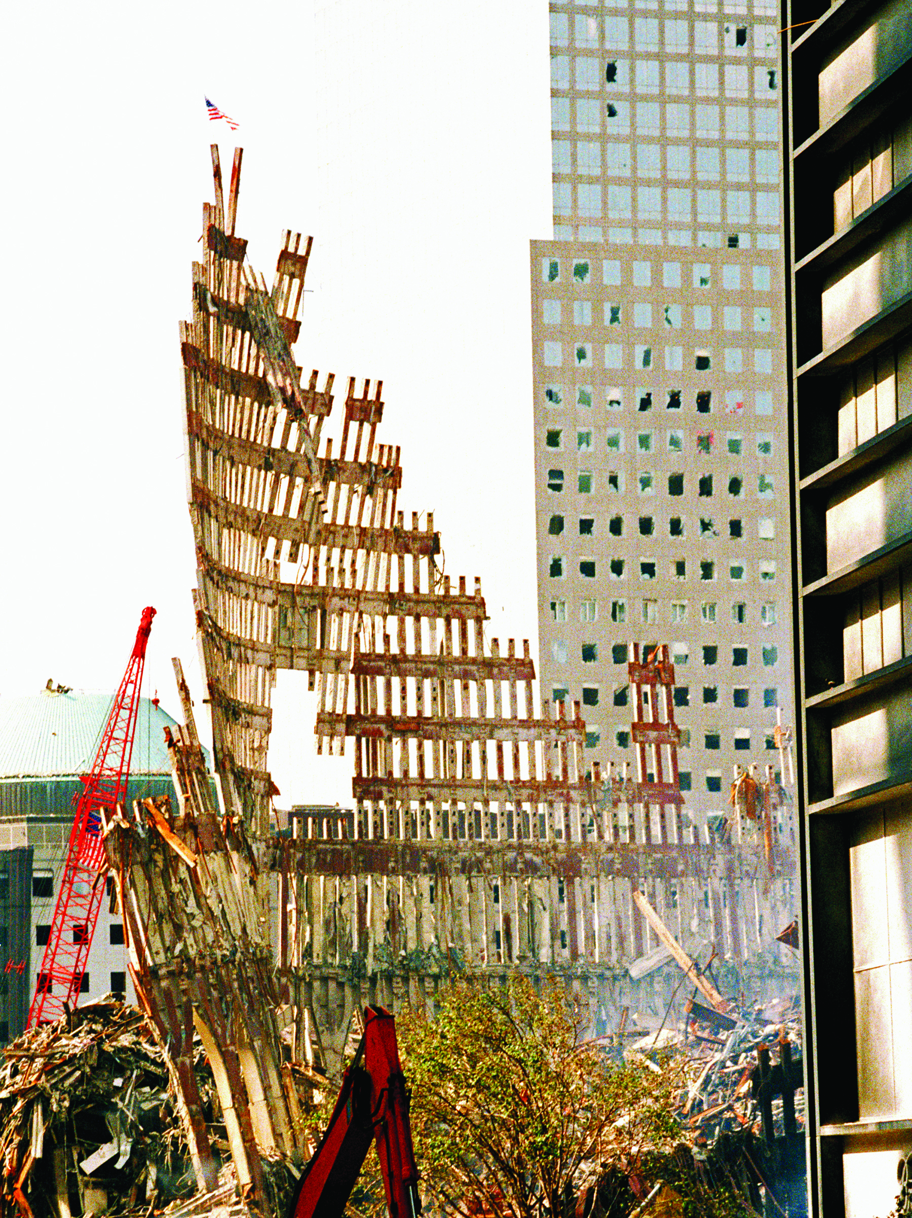 Previous ImageNext Image The aftermath of destruction on the World Trade Center NY Steel Skeleton of World Trade Center Tower South (one) in Ground Zero days after September 11, 2001 terrorist attack which collapsed the 110 story twin towers in New York, USA.