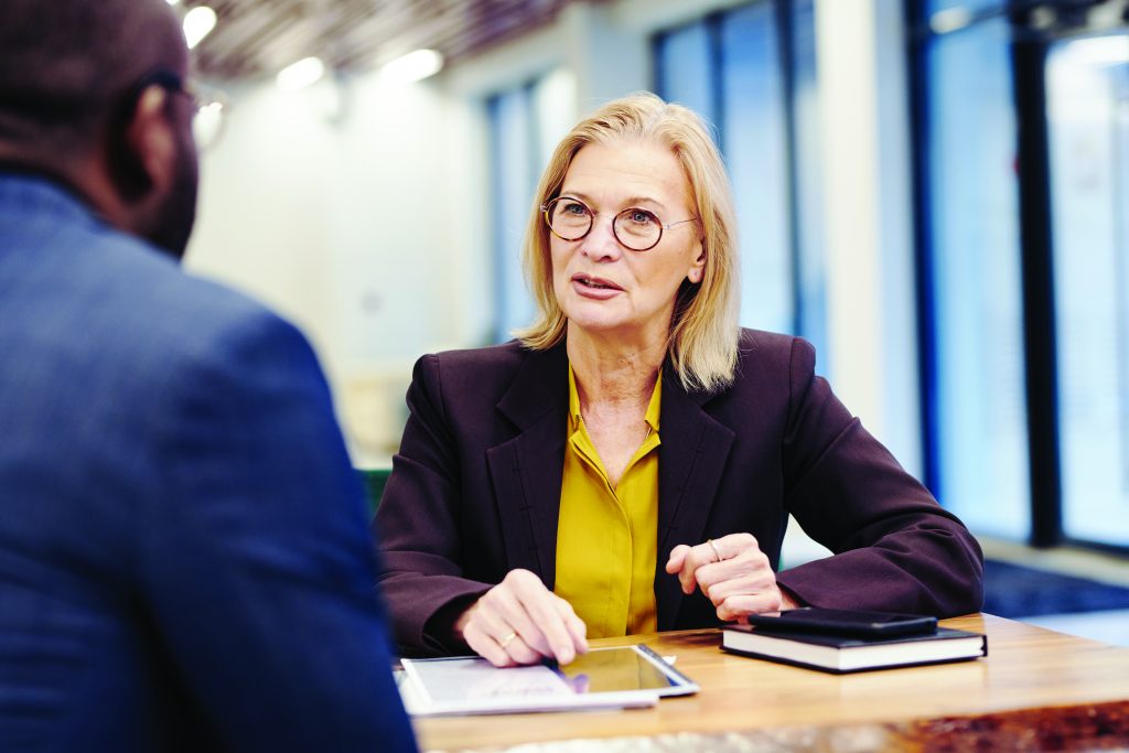 Previous Image Lawyer discussing deal with her client Professional mature lawyer sitting at the table and talking to the man, they discussing business during meeting Professional mature lawyer sitting at the table and talking to the man, they discussing business during meeting