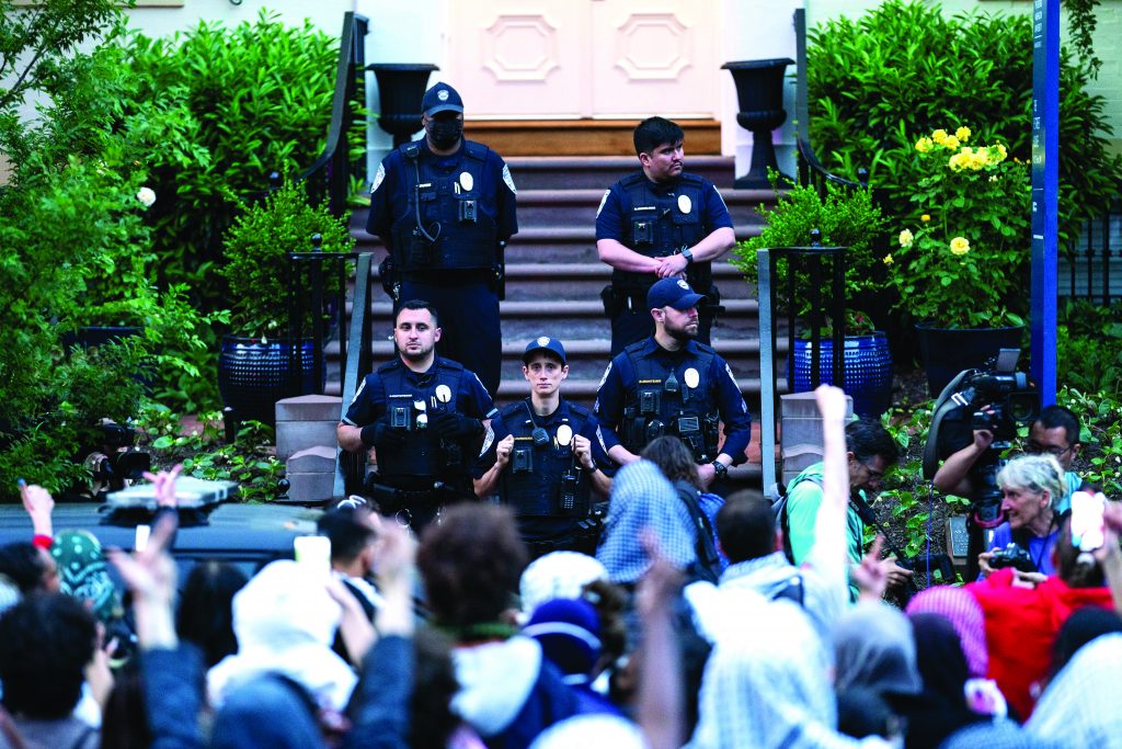 George Washington University police officers stand on the steps of The F Street House, which has long served as the home of the President, as Pro-Palestinian demonstrators marched from H Street near the now fenced off University Yard at George Washington University on May 9, 2024 in Washington, DC. The Pro-Palestinian encampment that occupied GWU’s University Yard for two weeks was cleared by police officers from the Metropolitan Police Department of the District of Columbia in the pre-dawn hours of May 8th, with more than 30 people being arrested, hours before DC Mayor Muriel Bowser was scheduled to testify before the House Oversight Committee. (Photo by Kent Nishimura/Getty Images)