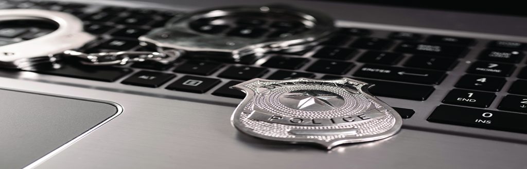Previous ImageNext Image Cyber Crime: Handcuffs and police badge on laptop. White collar crimes. Identity theft or corporate fraud.