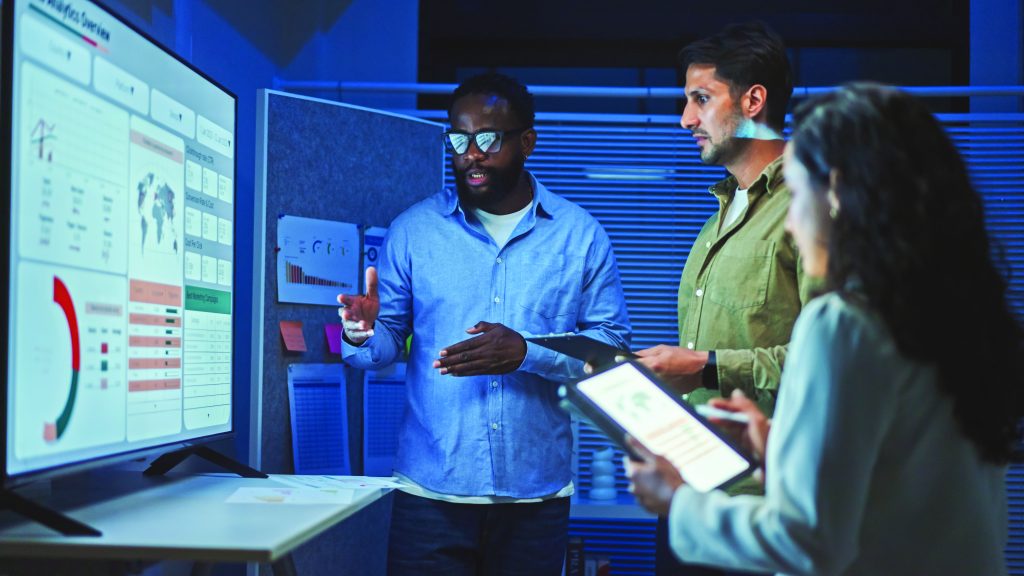 Previous ImageNext Image Data analytics team meeting at night. A team of multiethnic developers is meeting to review the data analysis of marketing from social media platforms.