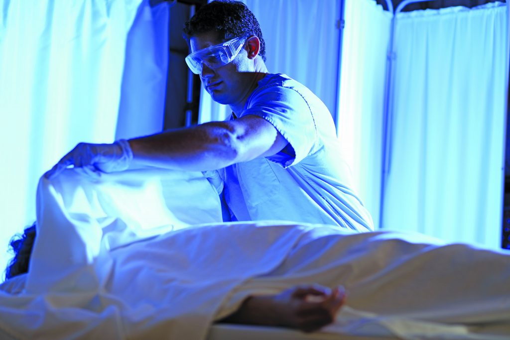 Next Image Medical Examiner with corpse in morgue. Medical examiner or forensic scientist with dead man’s corpse in morgue. He covers up the deceased man’s body with a white sheet after autopsy.