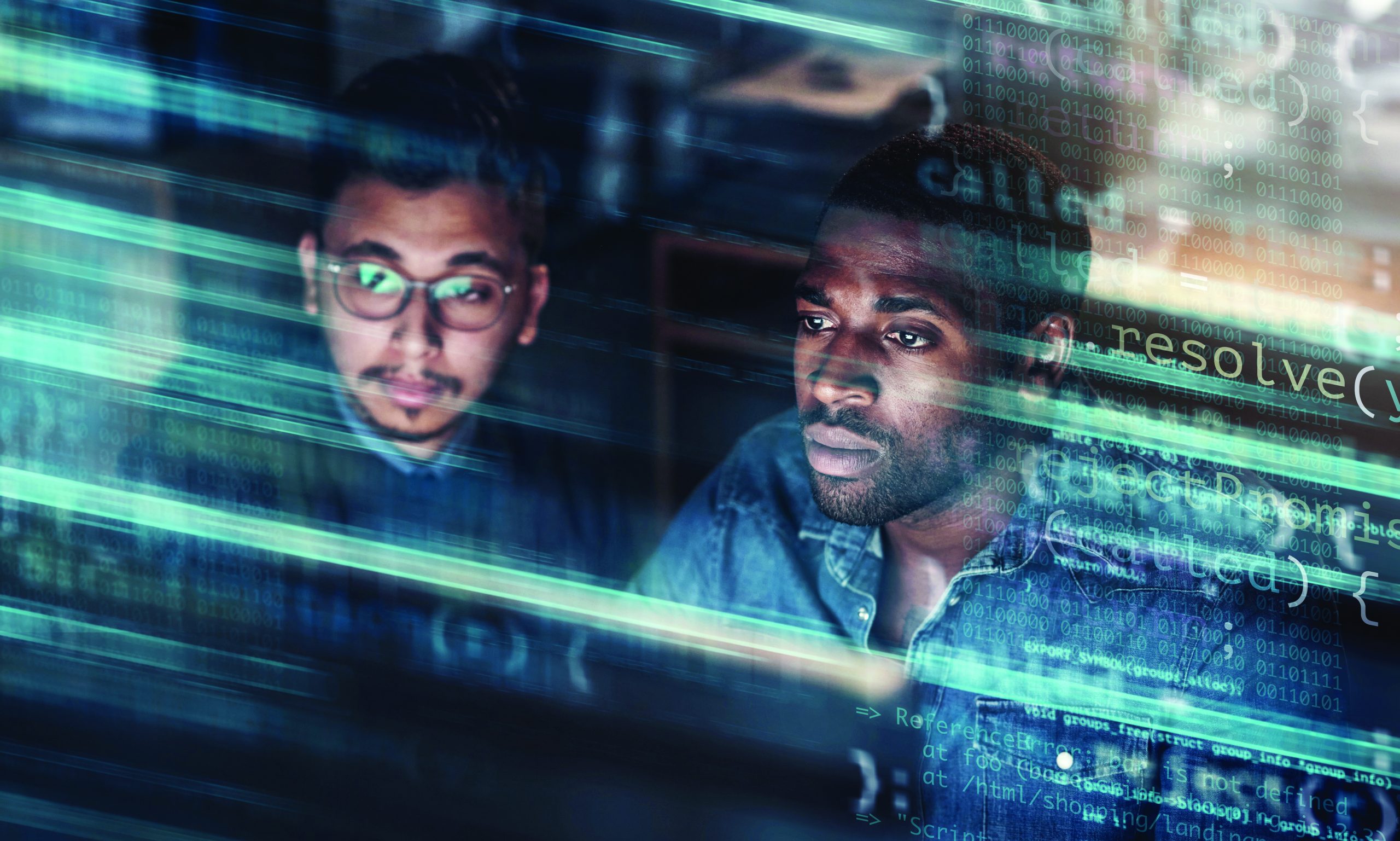 Previous ImageNext Image Digitally enhanced shot of two handsome businessmen working in the office superimposed over multiple lines of computer code Tonight’s task in the hands of the team