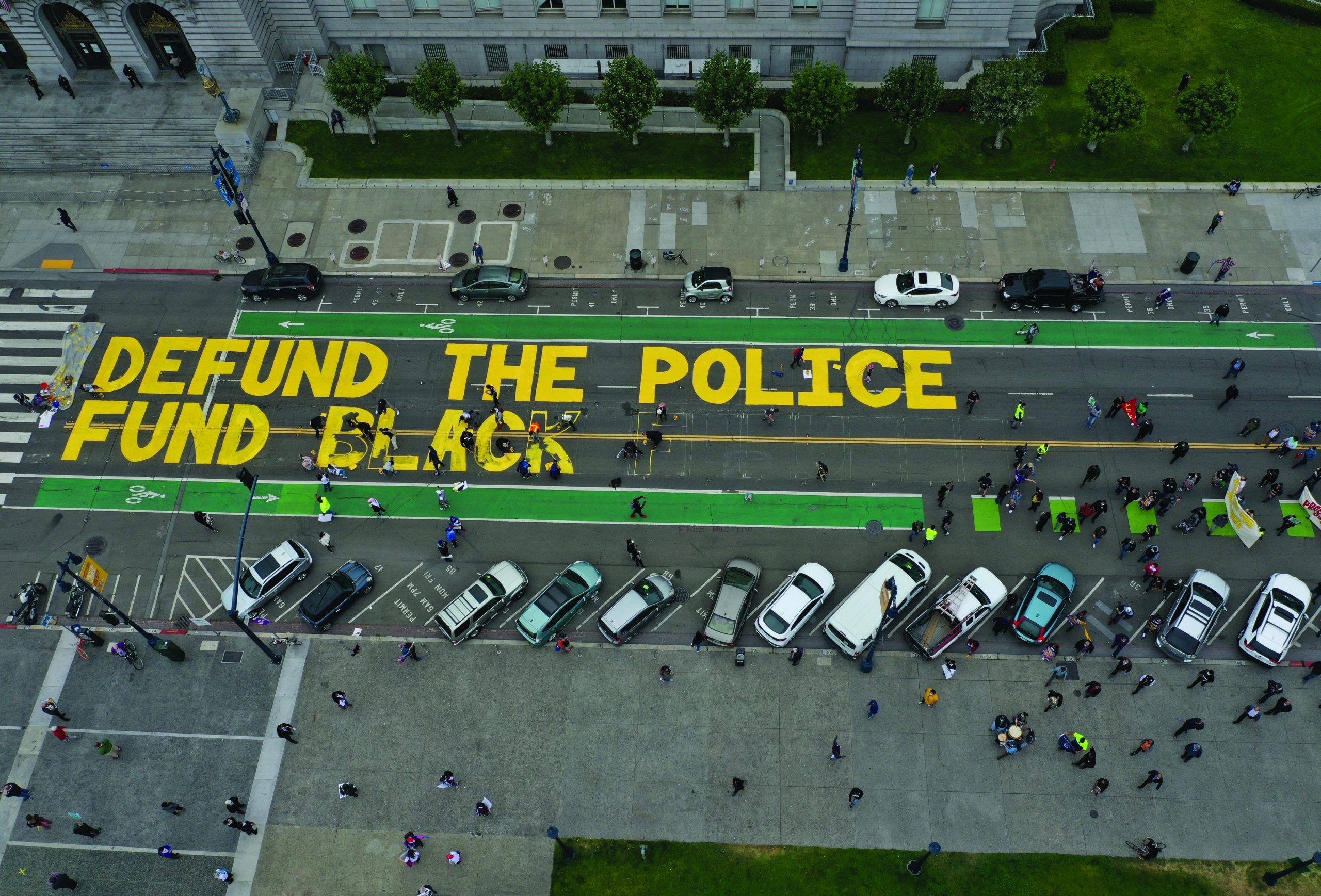 SAN FRANCISCO, CALIFORNIA – JULY 20: Protesters paint a mural that says ‘defund the police’ during a Strike For Black Lives demonstration outside of San Francisco City Hall on July 20, 2020 in San Francisco, California. The demonstration was part of the nationwide Strike for Black Lives effort which is calling for higher wages, better jobs, and Unions to help workers build economic power. (Photo by Justin Sullivan/Getty Images)