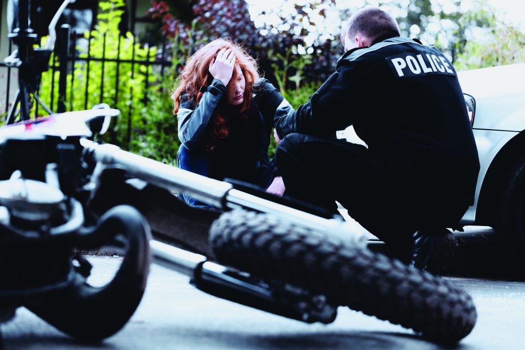Next Image Policeman interviewing motorbike driver Policeman interviewing a dazed driver of a motorbike after a crash
