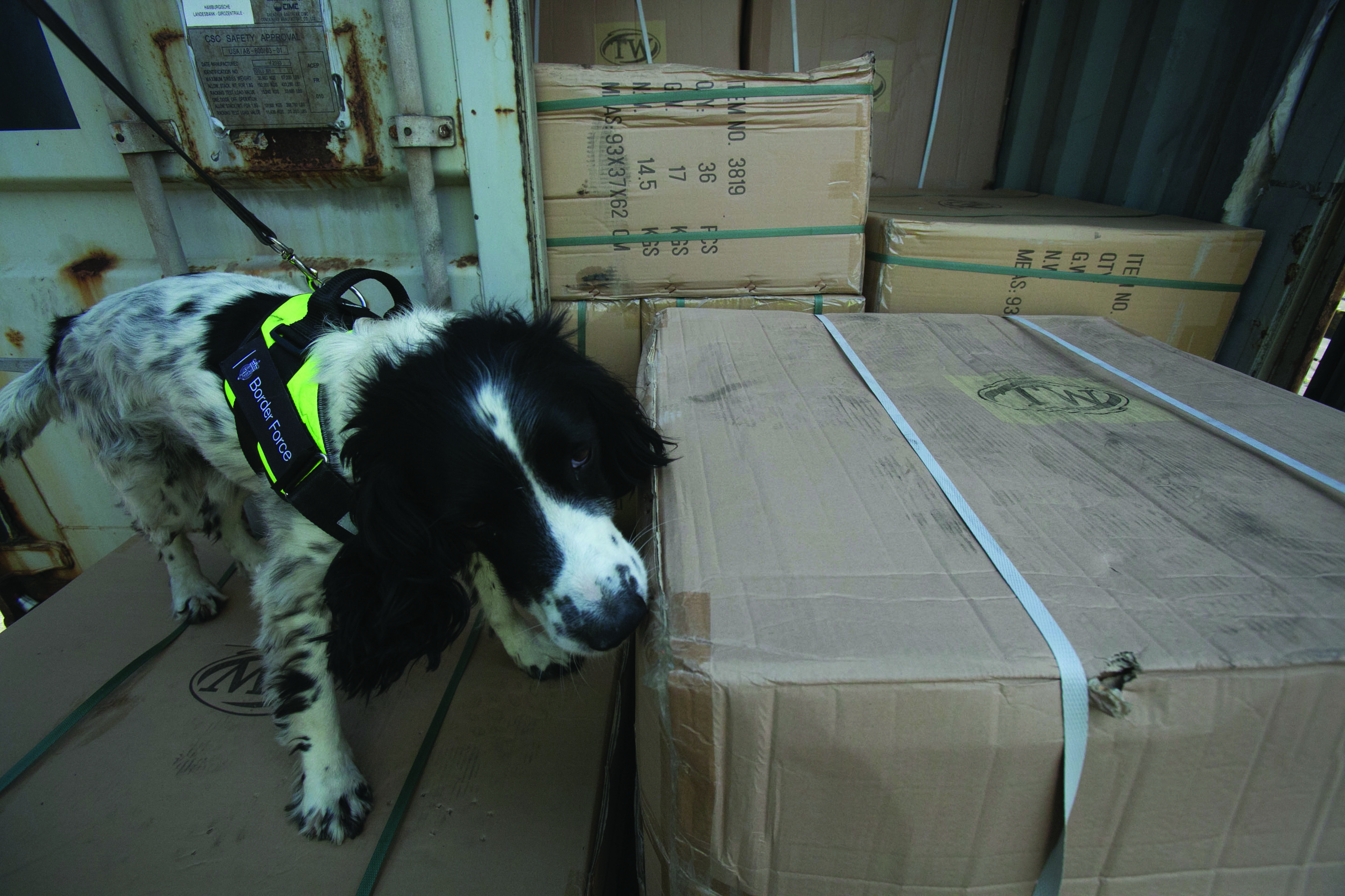 SOUTHAMPTON, UNITED KINGDOM – AUGUST 13: A Border Force detector dog checks inside a shipping container at Southampton docks on August 13, 2014 in Southampton, England. Border Force is the law enforcement command within the Home Office responsible for the security of the UK border by enforcing immigration and customs controls on people and goods entering the UK. Border Force officers work at 140 sea and airports across the UK and overseas. (Photo by Matt Cardy/Getty Images)