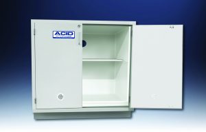Hemco’s Acid Storage Cabinet is specifically designed for the storage of corrosive chemicals and is available in 12-, 18-, 24-, 30-, 36-, 42-, and 48-inch widths. Standard size is 35″ high and 22″ deep. The molded one-piece fiberglass liner inserts directly into the cabinet and is sealed on all edges for ease of cleaning. The interior features a containment lip on the front bottom edge to hold spills. The front access doors have air inlet vents and are lined, and the edges are sealed. No metal is exposed to corrosive vapors. The shelf is removable for smaller container storage.