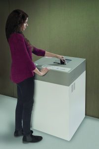 The FlashEx from Intimus is a rugged, durable shredder designed to quickly, easily, and safely destroy a wide variety of electronic media. FlashEx’s has a compact size and quiet operation. Items that can be easily destroyed by FlashEx include cellphones, mini tablets, USB sticks, CDs/DVDs, credit cards, and ID badges. Small items like CDs are fed into a narrow slot. Larger items are fed through a slide open/close feed slot on the top of the unit. Once an item enters the destruction chamber, heavy steel, claw-style cutters grab it and shred it to particles of only 4mm x 15mm.
