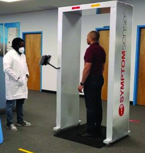 Soter Technologies announces the SymptomSense Medical Evaluation Gateway, a non-invasive walk-through electronic full-body symptom scanner for providing detection of symptoms of known illness in less than 10 seconds. SymptomSense looks similar to metal detectors used at security checkpoints of airports, sporting events, and government buildings. It uses an array of sensors to provide a rapid, noninvasive, hands-free approach for gaining important real-time vital signs, including detecting blood oxygen levels, external body temperature within 0.2 degrees of accuracy (Celsius), elevated heart rate, respiration rate, shortness of breath, lung congestion, height, and weight. Within seconds, the SymptomSense device provides health status with clear messaging and indicators for screening staff.