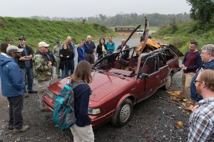 Nearby, on a high-speed track, a special agent drives an armored SUV through a controlled skid on a rain-slick patch of road, successfully maneuvering through a potentially fatal loss of control. The special agent then encounters a roadblock at high speed and threshold brakes. The special agent shifts into reverse and accelerates away before safely conducting a Y–turn, avoiding what could have been an armed ambush in a hostile country overseas.