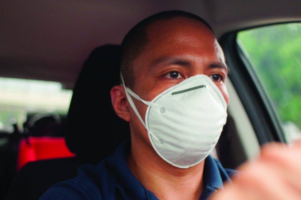 A young Southeast Asian man with a protective mask is driving a car A head shot of a young Southeast Asian man with a protective mask is driving a car