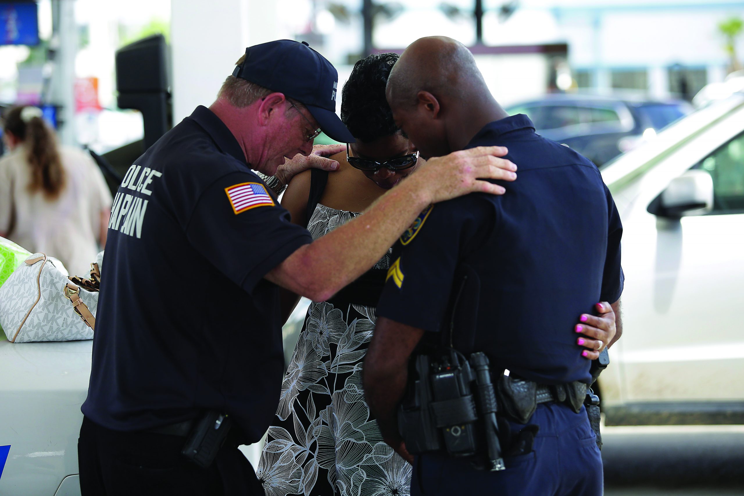 BATON ROUGE, LA – JULY 19: Millville, New Jersey police chaplain Bob Ossler (L) prays with Baton Rouge Police Department Corporal Trina Dorsey (C) and her brother Corporal Joseph Keller near a makeshift memorial for three police officers on July 19, 2016 in Baton Rouge, Louisiana. Three police officers were killed and several others wounded along Airline Highway Sunday when Gavin Long, who traveled from Kansas City, Missouri, ambushed the law enforcement officers. (Photo by Joshua Lott/Getty Images)