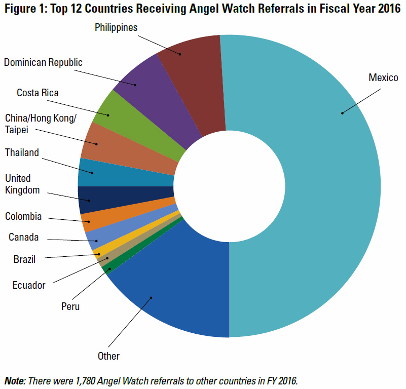 Next Image Figure 1 Top 12 Countries Receiving Angel Watch Referrals in Fiscal Year 2016 Note: there were 1,780 Angel Watch referrals to other countries in FY 2016 A pie chart depicting the top 12 countries receiving Angel Watch referrals in 2016