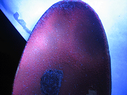 Most shoe insoles will show a footprint impression made by the wearer’s foot.21 Like footprints found at crime scenes, footprints on shoe insoles may need enhancement to make them more visible. To enhance insole footprints, photography with oblique lighting or alternate light sources, such as ultraviolet (UV) light, may be used as well as digital manipulation of photographs of the footprint impression with imaging software.