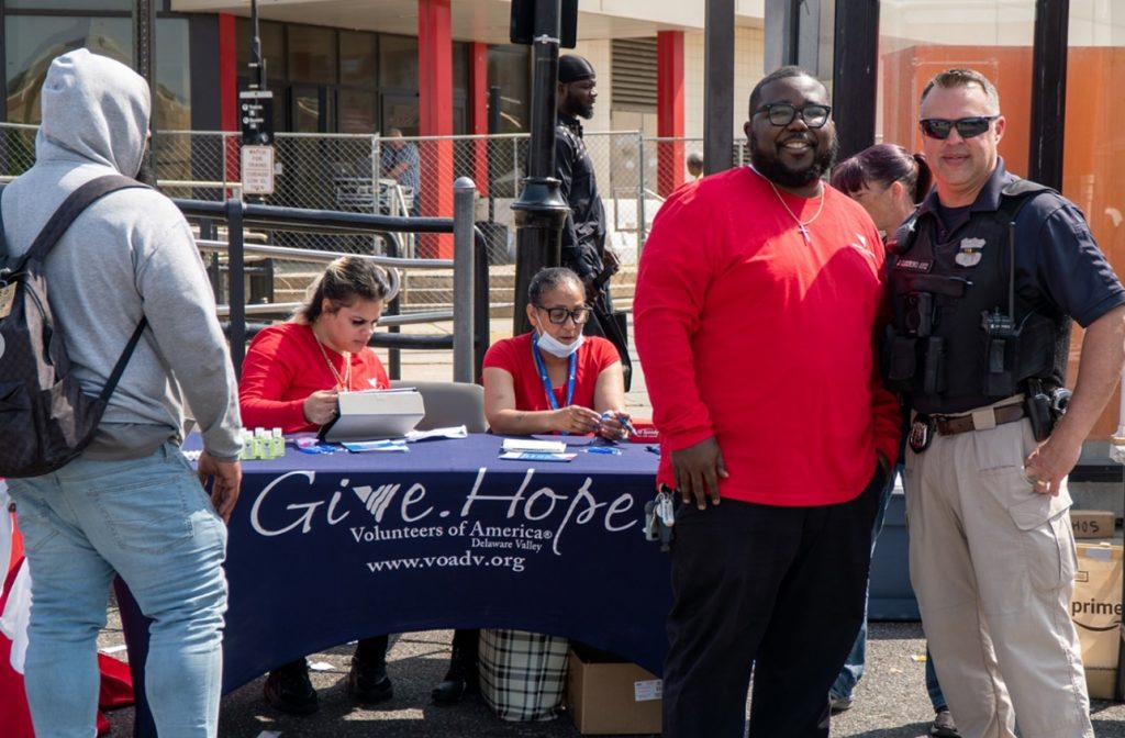 Previous ImageNext Image Hope-in-Action-Picture7 Officer Ludzieski at the outreach event with Volunteers of America. (Photo courtesy of New Jersey Transit Police Department).