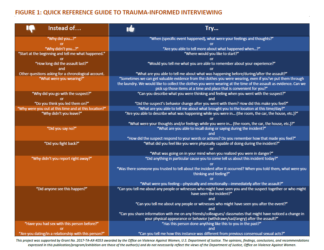 Successful Trauma-Informed Victim Interviewing: The phrasing of questions during victim interviews is critical. Depending on how a question is asked, victims may perceive the question as placing blame on them for their actions or for their inability to recall certain information. Trauma-informed victim interviewing re-phrases questions in a way that helps victims better retrieve memories, assists law enforcement in gathering more evidence, and supports victims. This approach increases the likelihood that victims will stay engaged in the criminal justice process.