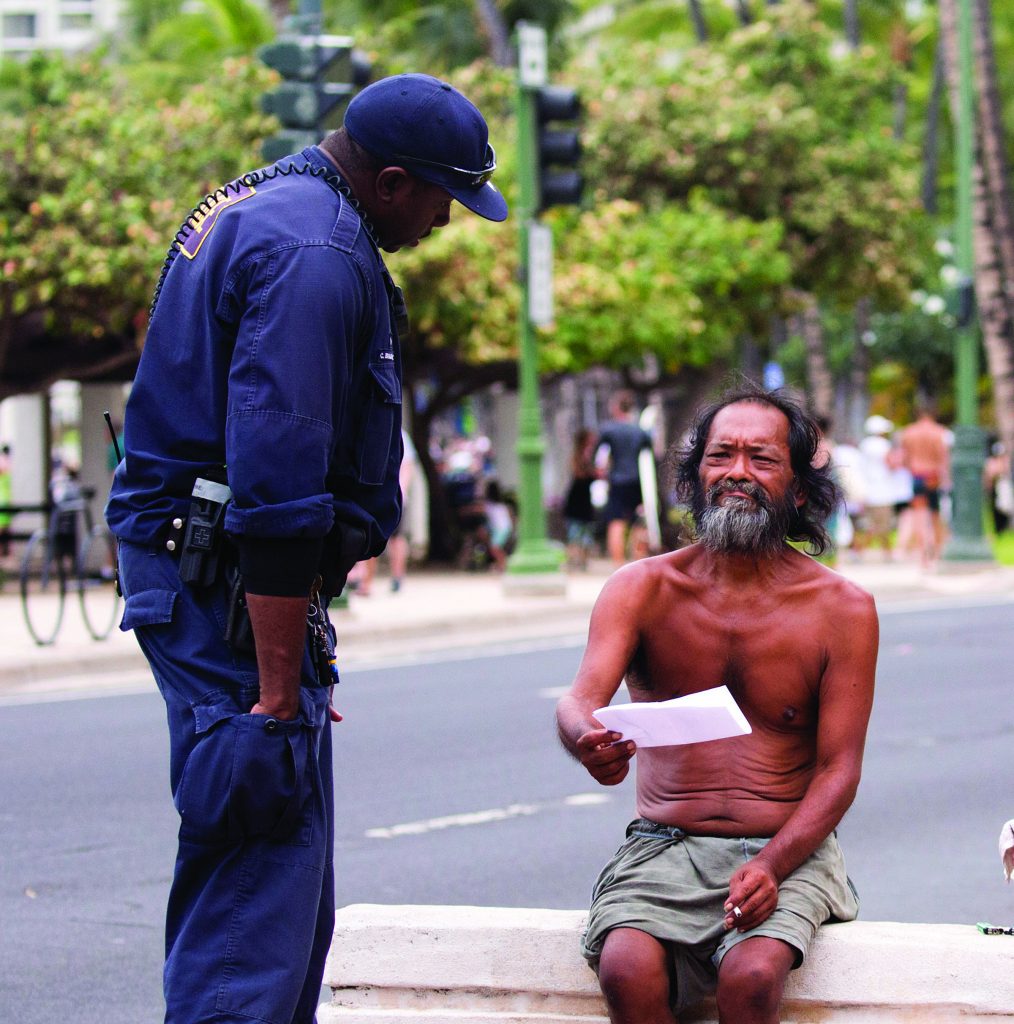 HONOLULU, HI – AUGUST 23: Honolulu police officer Cory Brailsford offers a homeless man a sheet with a list of shelters as Hurricane Lane approaches Waikiki Beach on August 23, 2018 in Honolulu, Hawaii. Hurricane Lane, which lashed the Big Island with nearly 20 inches of rain, has been downgraded to a Category 3 storm. (Photo by Kat Wade/Getty Images)