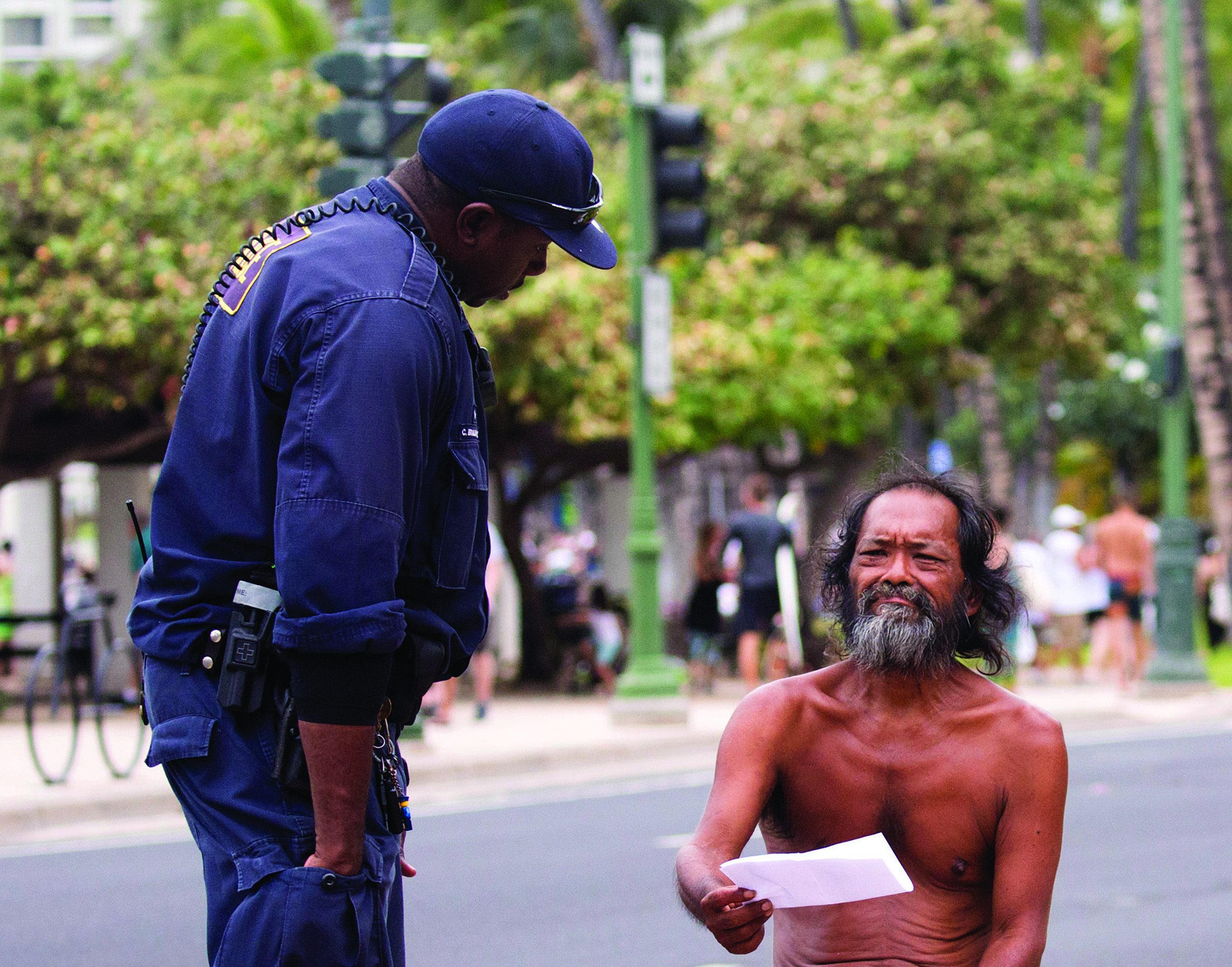 HONOLULU, HI – AUGUST 23: Honolulu police officer Cory Brailsford offers a homeless man a sheet with a list of shelters as Hurricane Lane approaches Waikiki Beach on August 23, 2018 in Honolulu, Hawaii. Hurricane Lane, which lashed the Big Island with nearly 20 inches of rain, has been downgraded to a Category 3 storm. (Photo by Kat Wade/Getty Images)