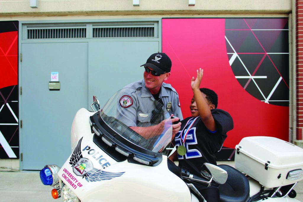 Previous ImageNext Image 38442298_10156316794106013_5608936828527706112_o UCPD Officer Kevin Ellison interacts with a local youth during the Peace Bowl (youth football tournament), sponsored by University of Cincinnati.