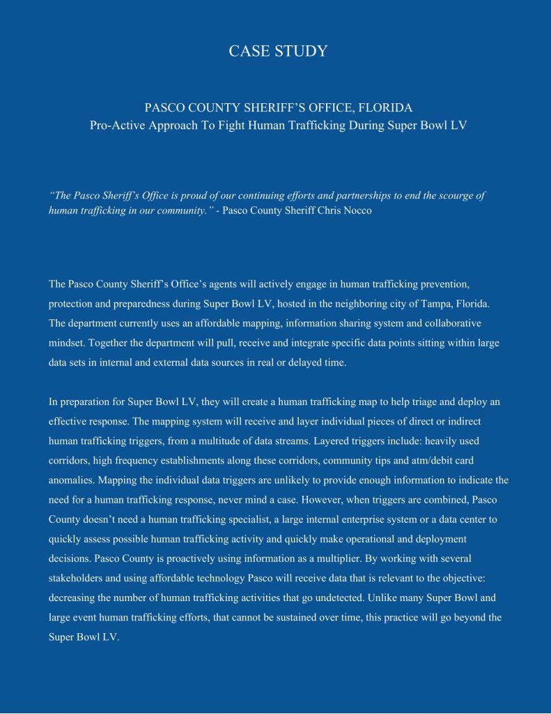 Stakeholders understand that sharing lessons learned and establishing best practices requires multiagency information sharing if the dismal arrest and criminal conviction rates are to be improved. Most fundamental and critical to execution is the quick, easy use of affordable and reliable technology that efficiently gathers, processes, and visualizes human trafficking triggers across several data sources. Traditionally, only businesses could afford sophisticated technologies to aid highly specialized efforts. For example, detection of labor trafficking throughout supply chains, which, when identified, is largely handled quietly and remains within the corporation. Today, these powerful technologies can be developed, maintained, and scaled economically and within the budgets of law enforcement agencies. However, before law enforcement can fully achieve sustainable value through these or any network effect technologies, one condition must be met—multidisciplinary, cross-sector data sharing.