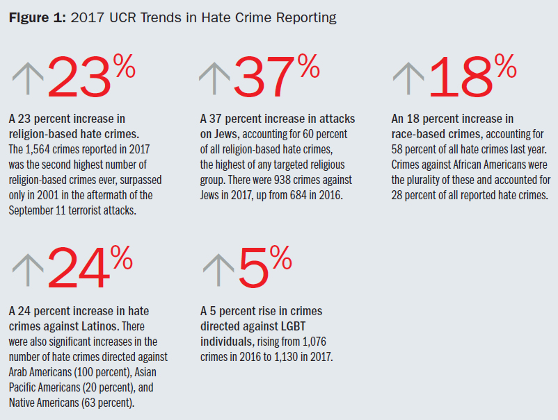 Next Image Fig 1 2017 UCR Trends in Hate Crime Reporting Information was reported by the Anti-Defamation League and extrapolated from the 2016–2017 FBI Hate Crimes Statistics Act (HCSA) report (https://www.adl.org/news/press-releases/adl-calls-on-leaders-to-redouble-efforts).