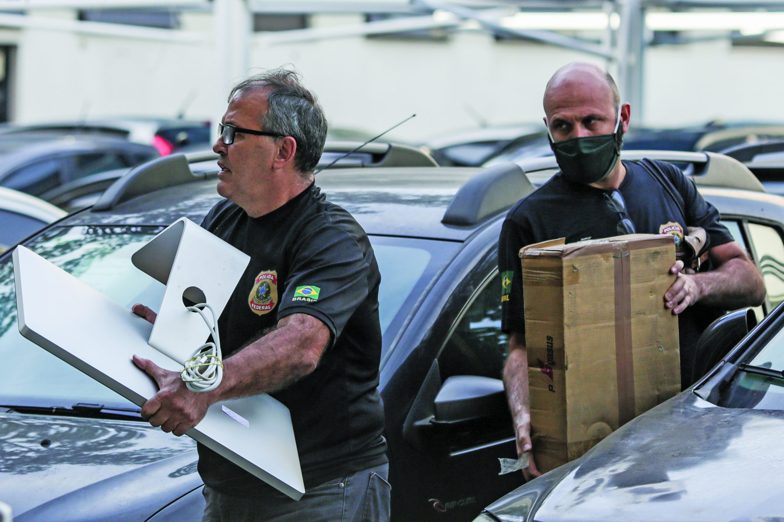 RIO DE JANEIRO, BRAZIL – JUNE 25: Federal Police officers carry seized evidence during operation Fiat Lux at federal police headquarters amidst the coronavirus (COVID-19) pandemic on June 25, 2020 in Rio de Janeiro, Brazil. This morning the Federal Police began Operation Fiat Lux, an arm of Operation Lava Jato that investigates fraud at Eletronuclear. There are 12 temporary arrest warrants and 17 search and seizure warrants, among them is the former Minister of Mines and Energy during the Lula government, Silas Rondeau. Another target of the operation is the businessman Jose Eduardo Telles Villas, accused of money laundering, foreign exchange evasion, corruption and criminal organization. (Photo by Andre Coelho/Getty Images)
