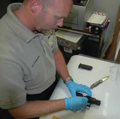 Previous ImageNext Image Phil-Clendenin Figure 3. Crime scene technician Phil Clendenin processes a Glock pistol and knife for touch/contact DNA evidence. Photo by Yvonne Martinez, PBPD