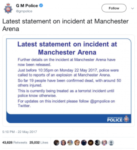 The Greater Manchester Police in the United Kingdom offer another graphic option. During the Manchester bombing in May 2017, they created graphics to quickly summarize key details of the incident in one place so that others did not need to scroll through their Twitter feed or read through a Twitter thread to cull information on what had occurred. They also ensured their name and logo were easily noticeable on the graphic so that there could be no mistake that the information was coming from their agency, and that, should the graphic be shared by news outlets and others, people would be able to readily tell it originated with the police.