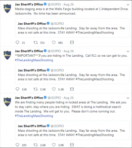This type of effective communication has been seen before—just take a look at the Jacksonville, Florida, Sheriff’s Office Twitter account. As the Jacksonville Landing Mass Shooting unfolded during a live-streamed video game tournament, the public information officer took total control of the process of disseminating information.4