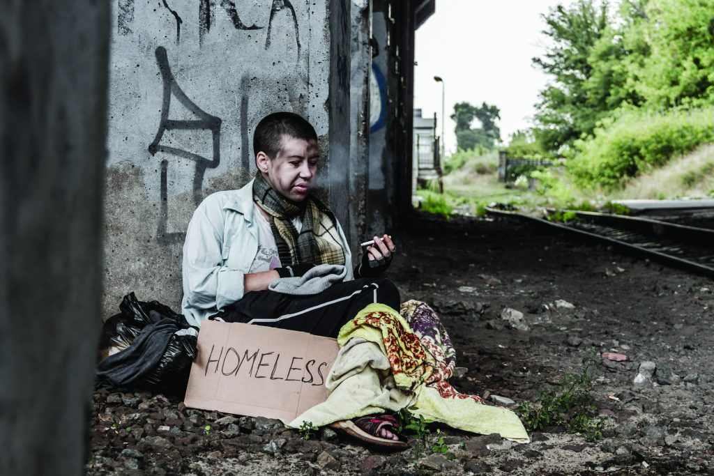 Previous Image Homeless woman smoking Homeless young woman with sign sitting near the rail track and smoking