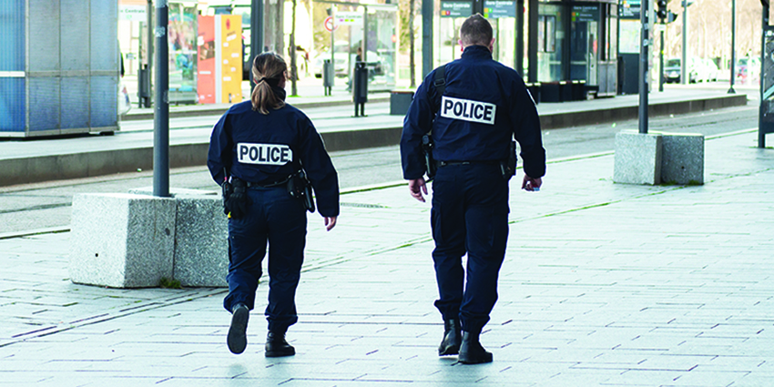 Previous ImageNext Image Mulhouse,-,France,-,17,March,2018,-,Two,National Mulhouse – France – 17 March 2018 – Two national policeman and police woman patrolling in front of the train station