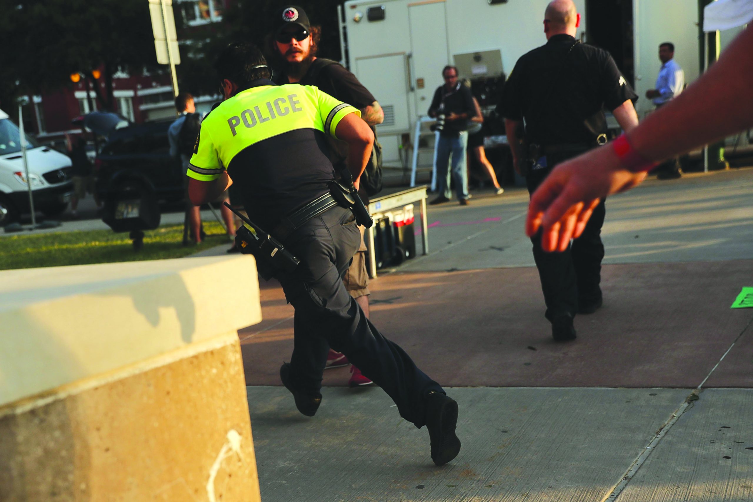 DALLAS, TX – JULY 10: Police run towards a building near the Dallas police department’s headquarters after a man was spotted standing on the ledge of the building on July 10, 2016 in Dallas, Texas. While the incident turned out to be harmless, many people in Dallas are still on edge after the death of five police officers last Thursday night by a lone shooter. Investigators are saying the suspect is 25-year-old Micah Xavier Johnson of Mesquite, Texas. This is the deadliest incident for U.S. law enforcement since September 11. (Photo by Spencer Platt/Getty Images)